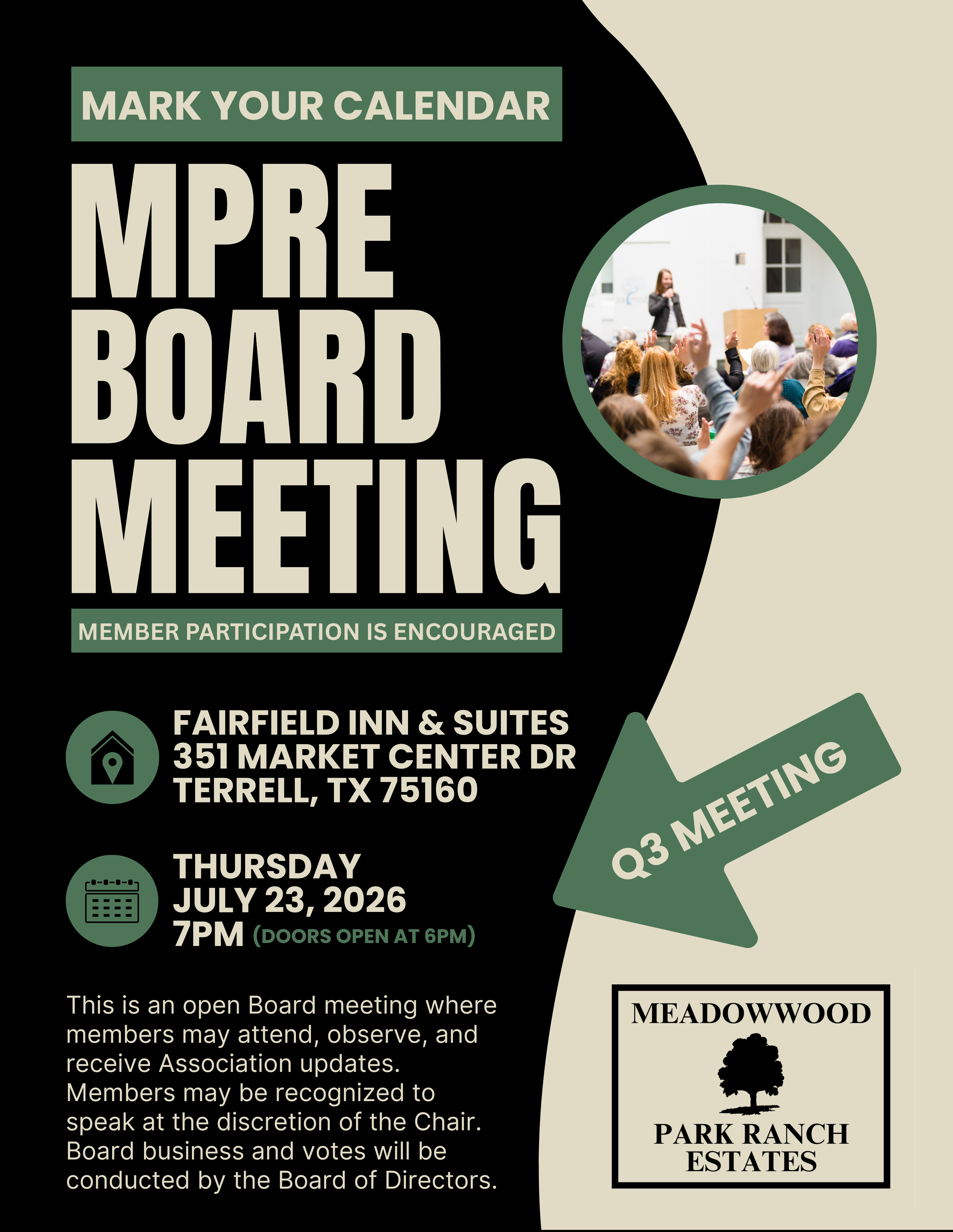 The Board of Directors of Meadowwood Park Ranch Estates, Inc. Property Owners Association invites all Members to attend the Quarterly Meeting.
